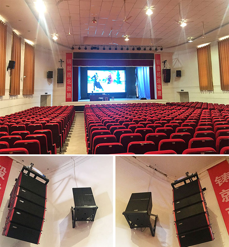 解放軍93956部隊禮堂主要服務于大型會議、報告演講、文藝匯演及電影放映需求,禮堂擴聲系統由ELA線性陣列搭配EKS系列專業音箱、EKA系列功放、專業麥克風及其它周邊處理設備組成。