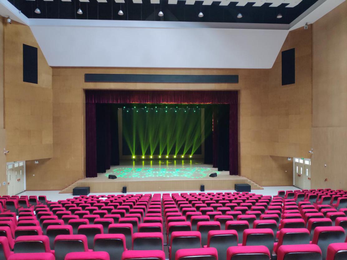此外,還為許昌中學1000平的大禮堂建設了專業擴聲系統, 根據大禮堂的面積以及使用需求,參考國家廳堂擴聲設計標準一級進行設計,主要由聲源、音頻處理設備、功放及揚聲器系統組成。設計中所選的揚聲器是根據觀眾區的具體位置和面積,組成“點”聲源陣列,有效降低陣列的梳狀濾波效應,因此特選用恒指向揚聲器,有利于語言清晰度的提高,保證觀眾區都處于揚聲器的覆蓋范圍內。
