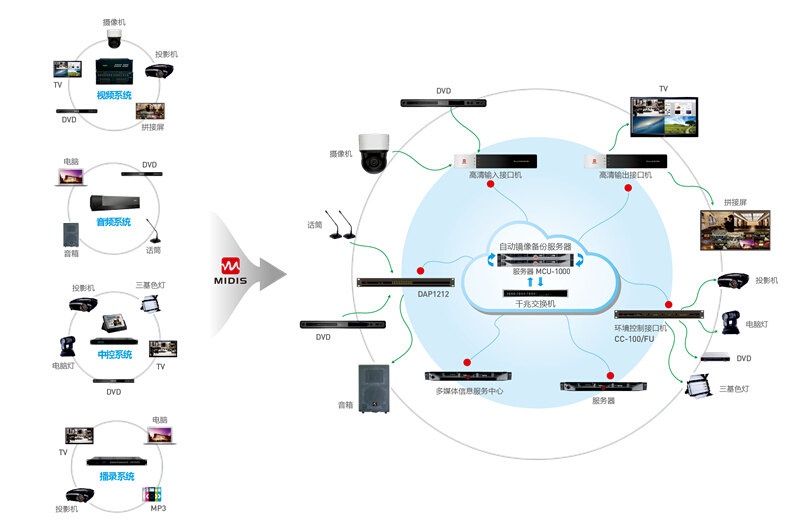 從設(shè)計(jì)方面來(lái)說(shuō),MIDIS不同于以往傳統(tǒng)AV系統(tǒng)集成方案,以往面臨的是復(fù)雜的系統(tǒng)集成,面臨多廠商之間的配合問(wèn)題、設(shè)計(jì)師忙于考慮多格式轉(zhuǎn)換、傳輸距離、抗干擾措施等多種問(wèn)題,設(shè)計(jì)師在設(shè)計(jì)傳統(tǒng)系統(tǒng)方案是非常困難的。而MIDIS系統(tǒng)是將所有音視頻、控制等諸多信息元素全部數(shù)字化、網(wǎng)絡(luò)化,在標(biāo)準(zhǔn)的千兆網(wǎng)上進(jìn)行傳輸、控制、顯示、存儲(chǔ)等。由于MIDIS是在單一網(wǎng)絡(luò)平臺(tái)上承載所有多媒體信息,不存在以上所有的問(wèn)題,給設(shè)計(jì)師提供一個(gè)簡(jiǎn)潔的、集成化設(shè)計(jì)方案。