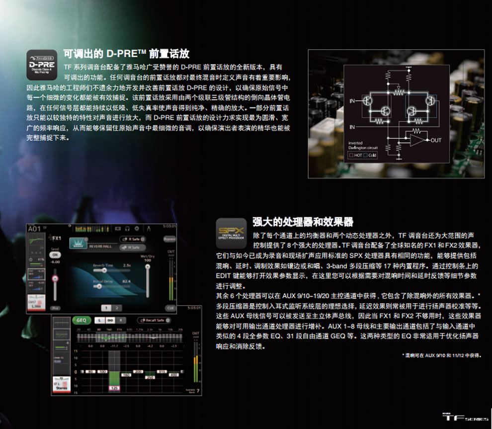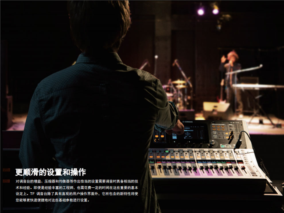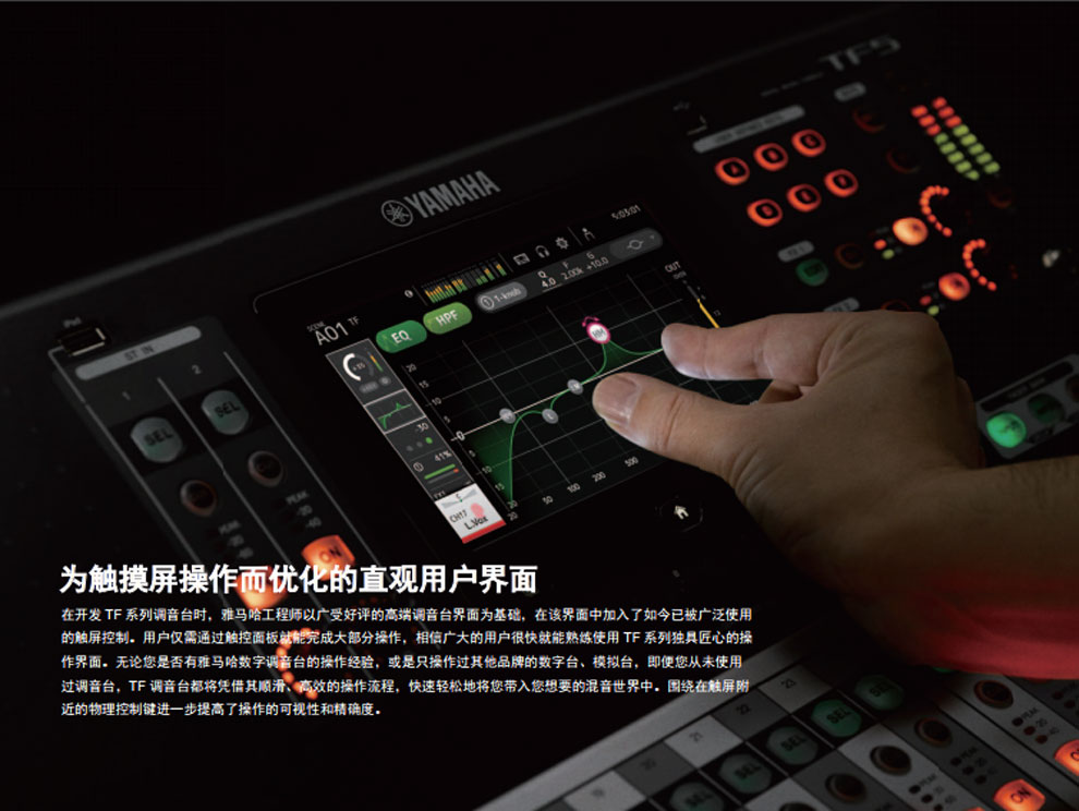 雅馬哈數字調音臺的設計一直遵循全球音響工程師的理念,確保工程師能夠獲得最為高效、直觀的操作體驗。廣受贊譽的選定通道(Selected Channel)和中央邏輯(Centralogic™)界面足以證明這一設計理念的成功性。TF系列調音臺結合了雅馬哈在調音臺領域的全新突破和最新觸屏技術,為用戶帶來了更佳的調音臺體驗。流暢的設置和操控、實用性極高的預設和場景功能,精煉的外觀設計,與整套系統無縫