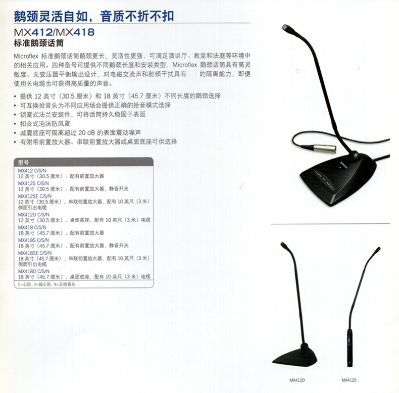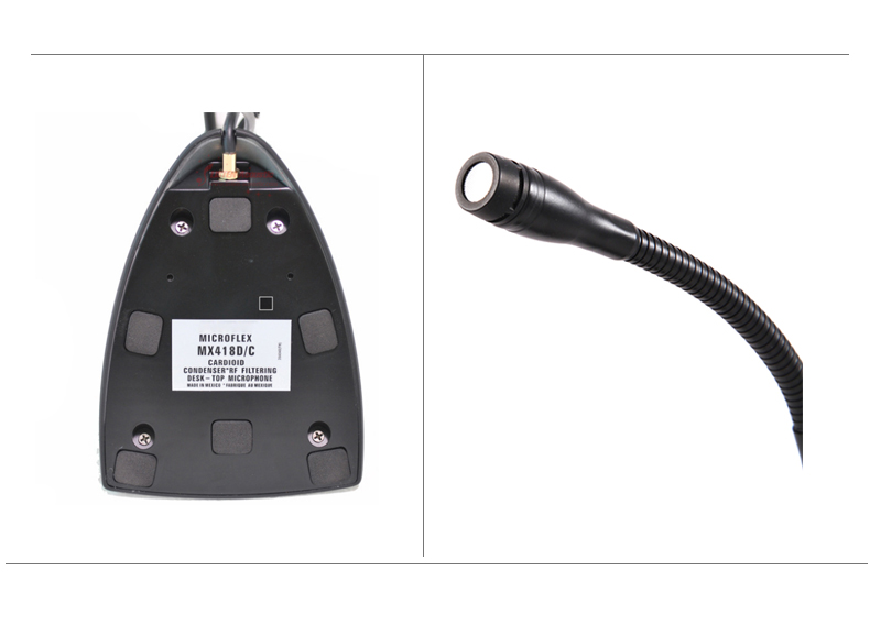 Microflex鵝頸話筒共有四種型號,話筒高度和安裝方式各不相同,但都配備舒爾Microflex特有的帶LED指示燈的靜音開關。每款Microflex鵝頸話筒都具有高靈敏度和不帶變壓器的平衡輸出,極大程度提高了對電磁交流聲和射頻干擾的抗擾度,即使是長距離電纜傳輸也沒有問題。每款Microflex鵝頸話筒都隨附完整的安裝套件,包括金屬鎖扣件和泡沫防風罩、扣合式話筒減震架轉接頭。